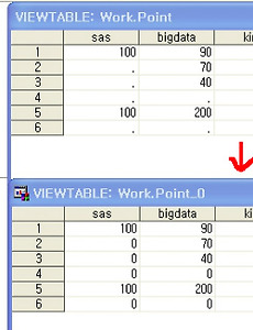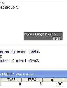 sas에서 if문과 substr함수를 이용하여 관측치 일부분 수정하는 방법을 알아보자. 먼저 샘플데이터가 필요하므로 ace라는 간단한 데이터셋을 생성하였다. [코딩과정] data ace1; set ace; new_a=a; if substr(new_a,1,1)='A' then substr(new_a,6,1)=1 ; else if substr(new_a,1,1)='B' then substr(new_a,6,1)=2; if substr(new_a,1,1)='A' then substr(new_a,1,1)=0; else if substr(new_a,1,1)='B' then substr(new_a,1,1)=0; run; [설명] a변수를 new_a라는 변수로 하나 더 생성 한것은 한눈에 비교하기 쉽고자 생성하였다. ..