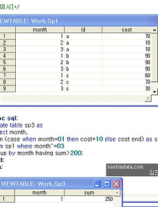 sas에서 proc sql 문장을 이용해서 기술통계량을 구하는 방법을 알아보고, 문장구조에 대해서도 알아보자. [문장구조] proc sql; create table 결과 데이터셋명 as select 그룹변수명, sum(변수명) as sum, count(변수명) as n, avg(변수명) as mean, max(변수명) as max, min(변수명) as min, std(변수명) as std from 입력 데이터셋명 where 입력 데이터에 대한 조건식 group by 그룹변수명 having 결과 데이터 조건식; quit; run; [예제] [예제 및 코딩 설명] month, id, cost라는 변수 세개를 가진 sp1이라는 데이터셋이 있다. create table sp2 → sp2라는 결과 데이터 셋을 ..